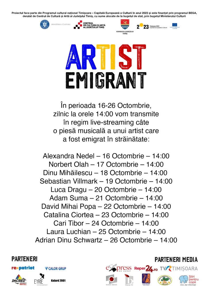 „Artist Emigrant” este o serie despre muzicieni timișoreni care au fost sau încă sunt plecati în vestul Europei. Este un proiect exclusiv pentru online și TV. Începand din 16 Octombrie, pe pagina oficiala de Facebook a proiectului „Artist Emigrant”, vom transmite zilnic în regim LIVE, la ora 14:00, cate un episod (conceput ca un „spectacol muzical digital”).