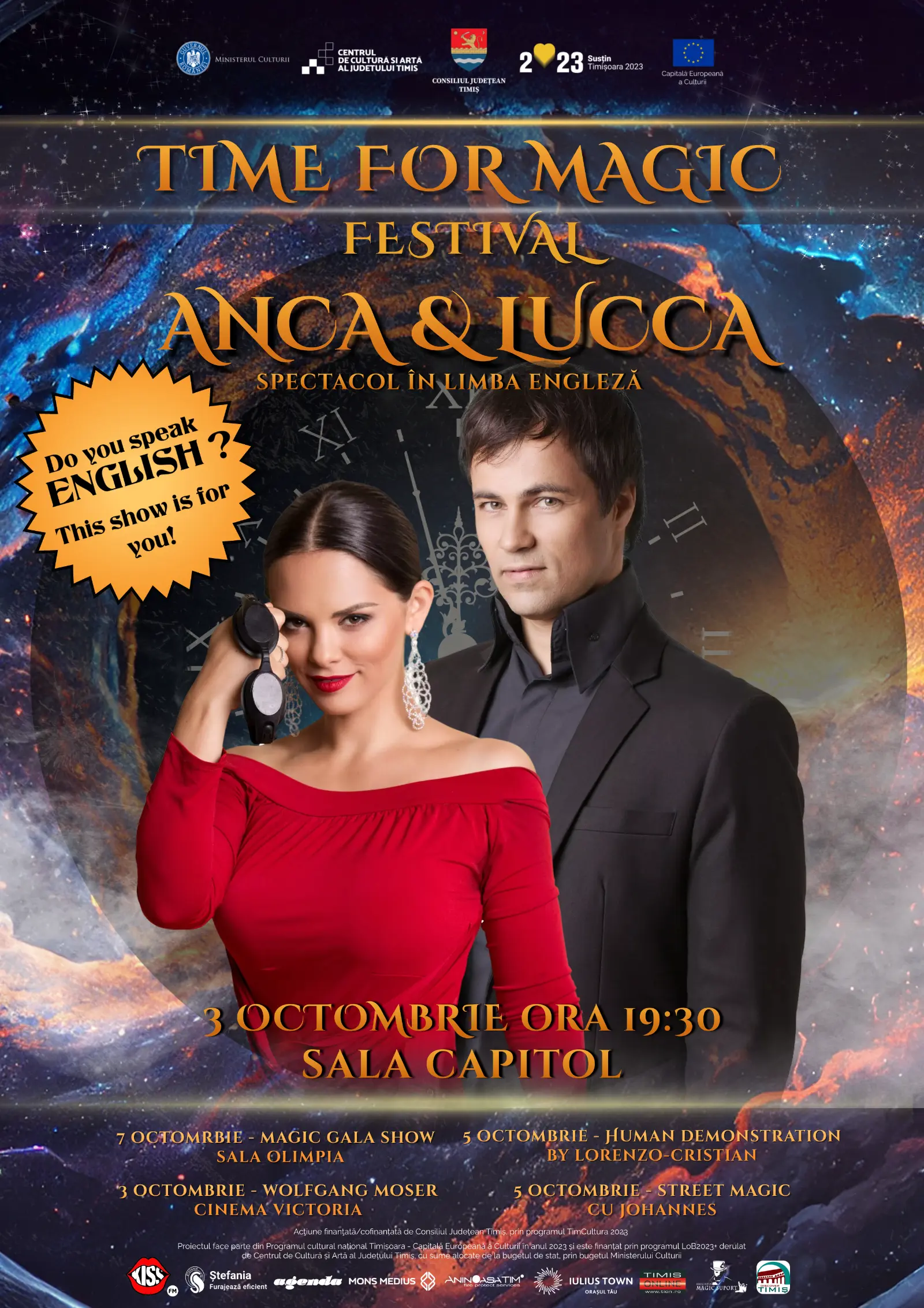 03 octombrie, ora: 19:300, Spectacol de Magie în Limba Engleză, susținut de Campionii Mondiali la Mentalism, Anca și Lucca, la Sala Capitol a Filarmonicii Banatului. Fiind foarte apreciați anul trecut, revin la Timisoara, de data aceasta cu un spectacol complet ce va uimi publicul.