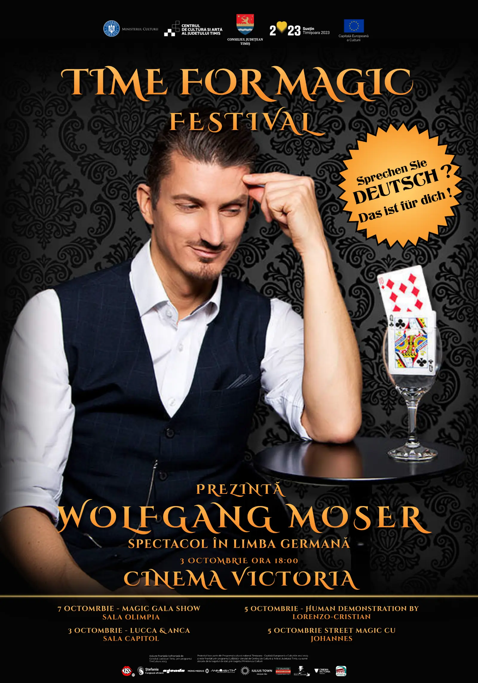 03 octombrie- ora: 18:00, Spectacol de Magie în Limba Germana, cu maestrul Wolfgang Moser, la Cinema Victoria. WOLFGANG MOSER (Austria) este magicianul vienez cu cele mai multe bilete vandute.